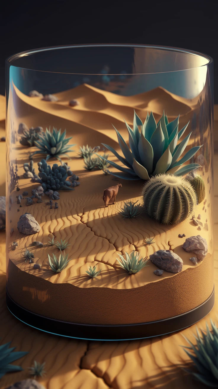 This minimalist terrarium features drought-loving succulents nestled in sandy layers of warm tones — golden, tan, and beige. The mix of cacti, stones, and textured soil creates a serene, low-maintenance landscape that thrives in sunlight. Perfect for those who love simplicity and strength in nature.